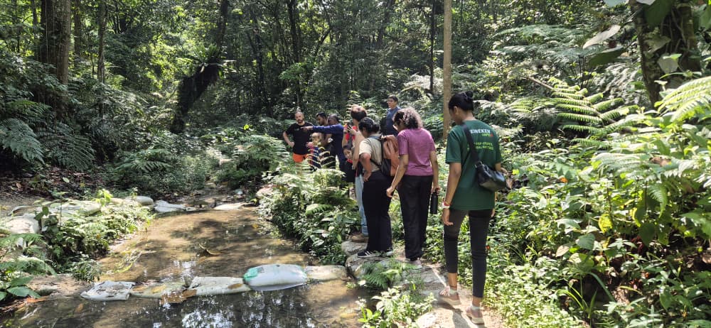 The programme began at Station 1 – Source of Sungai Penchala, where Dr. K. Kalithasan and Ms. Jage introduced the Global Environment Centre (GEC) and the W.A.T.E.R Project, funded by the SPARK Foundation. Participants were then invited to trace the journey of tiny water droplets that merge to form the Sungai Penchala stream, building awareness of the river’s origins.